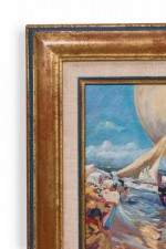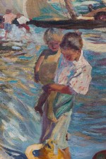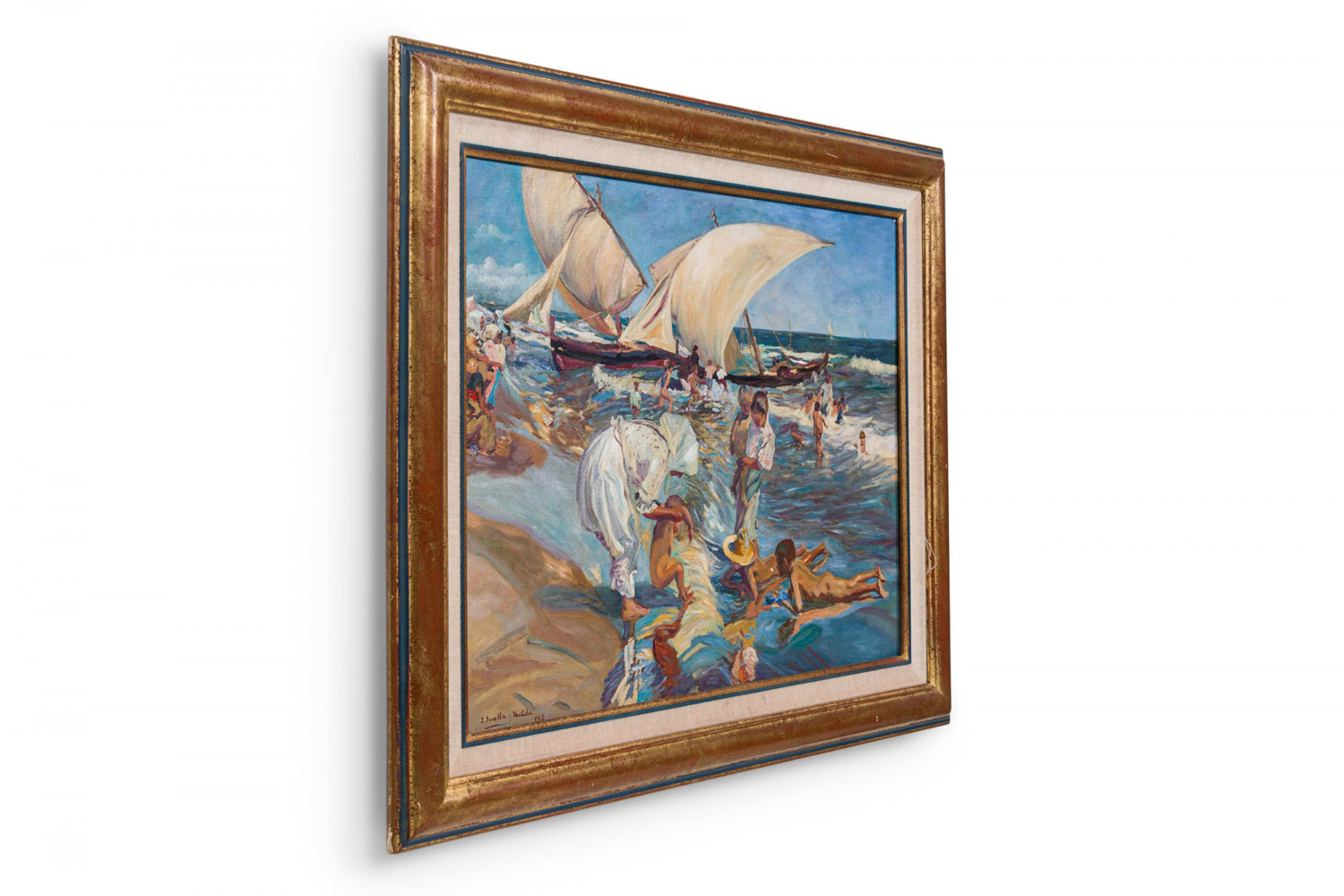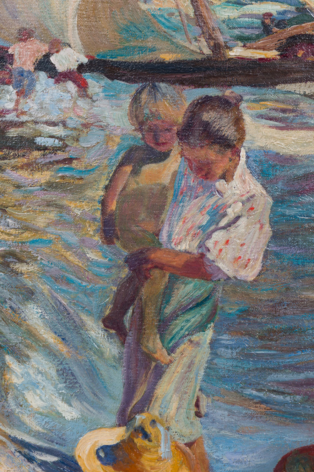 Copy of a painting showing a busy day on the beach with sailboats, bathers and children in the surf.