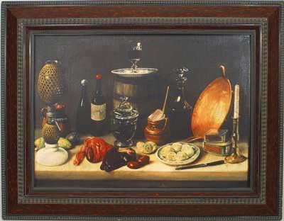 Copy of a Dutch Flemish still life painting showing a table set with meats, wine, fruits and crystal.