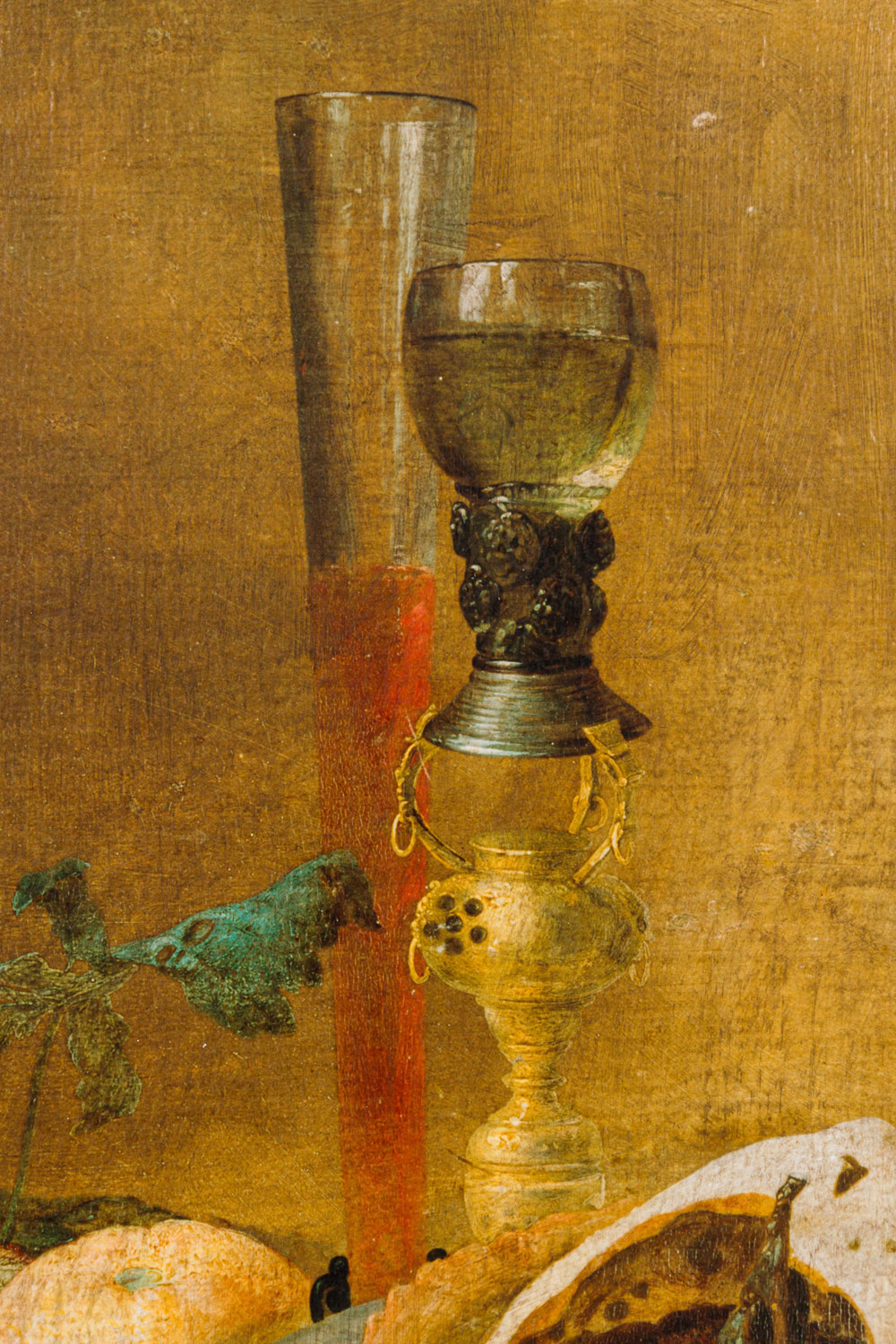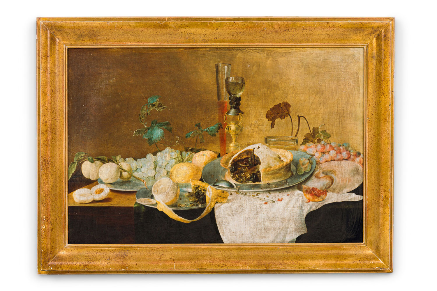 Copy of a Dutch Flemish still life painting titled "A Table of Desserts" showing wine, fruits and pie in copious amounts