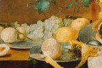 Copy of a Dutch Flemish still life painting titled "A Table of Desserts" showing wine, fruits and pie in copious amounts.