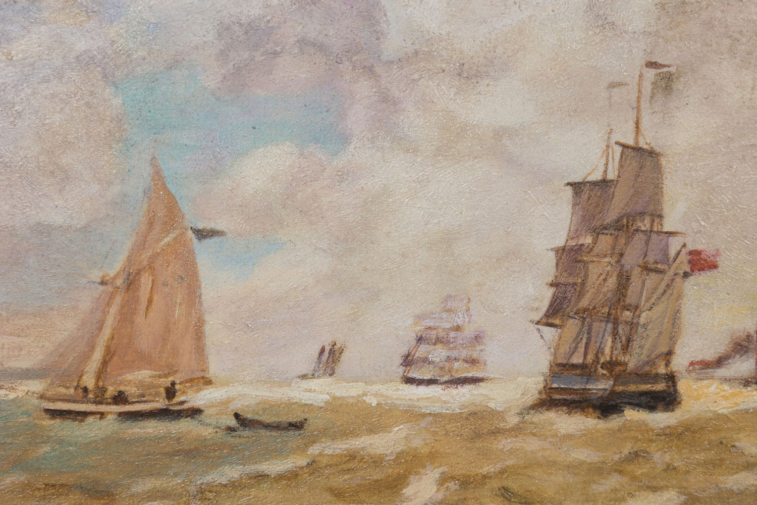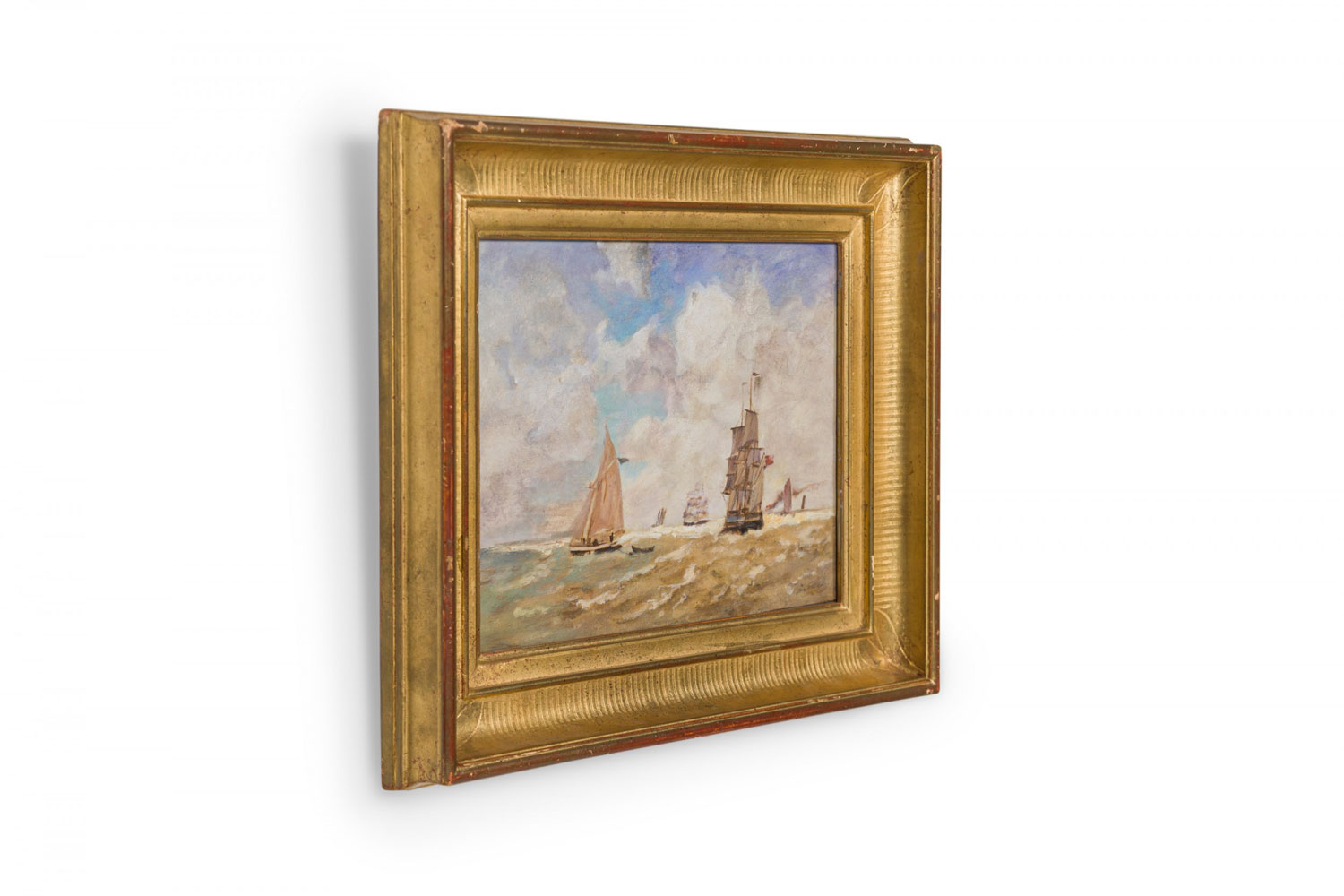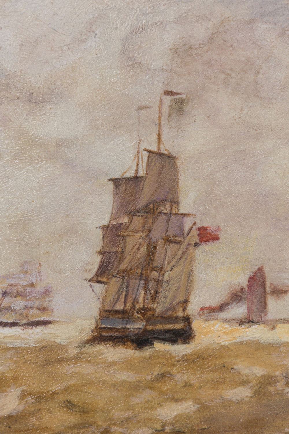 Copy of a French Impressionist seascape painting of tall ships at sea with smaller boat in foreground