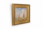 Copy of a French Impressionist seascape painting of tall ships at sea with smaller boat in foreground.