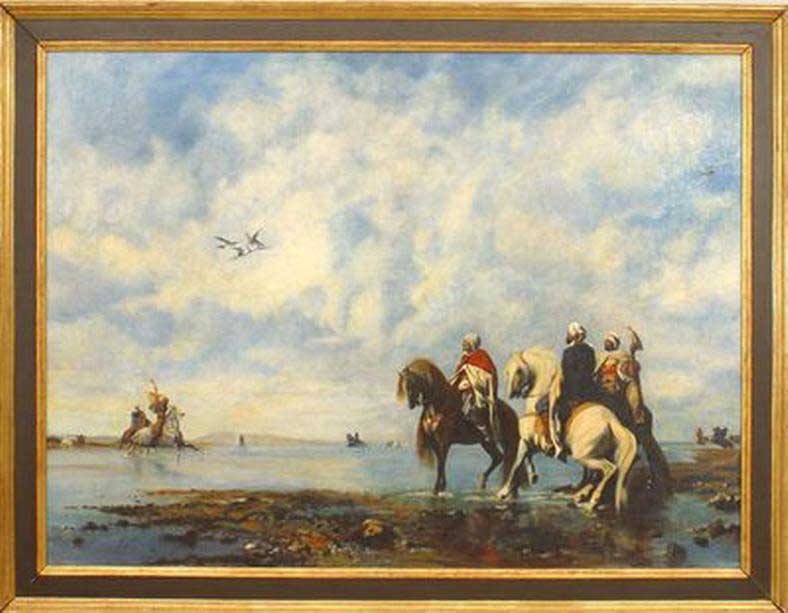 Copy of a hunt scene painting showing Arabs on horse flying their falcons for sport at water's edge
