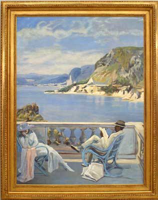 Copy of a painting by Sir John Lavery in an Impressionist style titled,"On The Riviera" showing a couple on a terrace overlooking the sea.