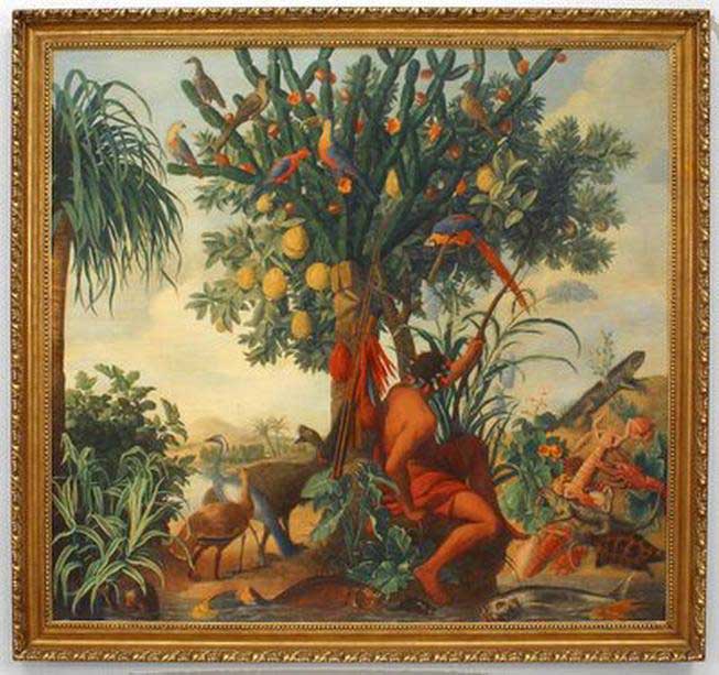 Copy of a painting showing a Native American under a cactus tree festooned with fruits and birds