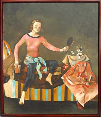 Copy of a painting showing a young girl on a striped divan holding a hand mirror next to a kitten