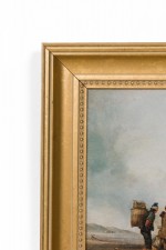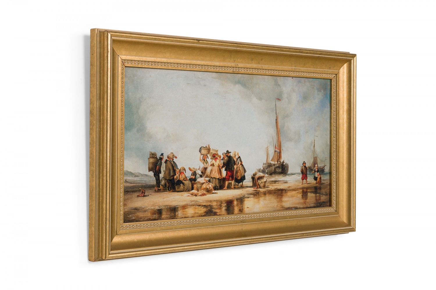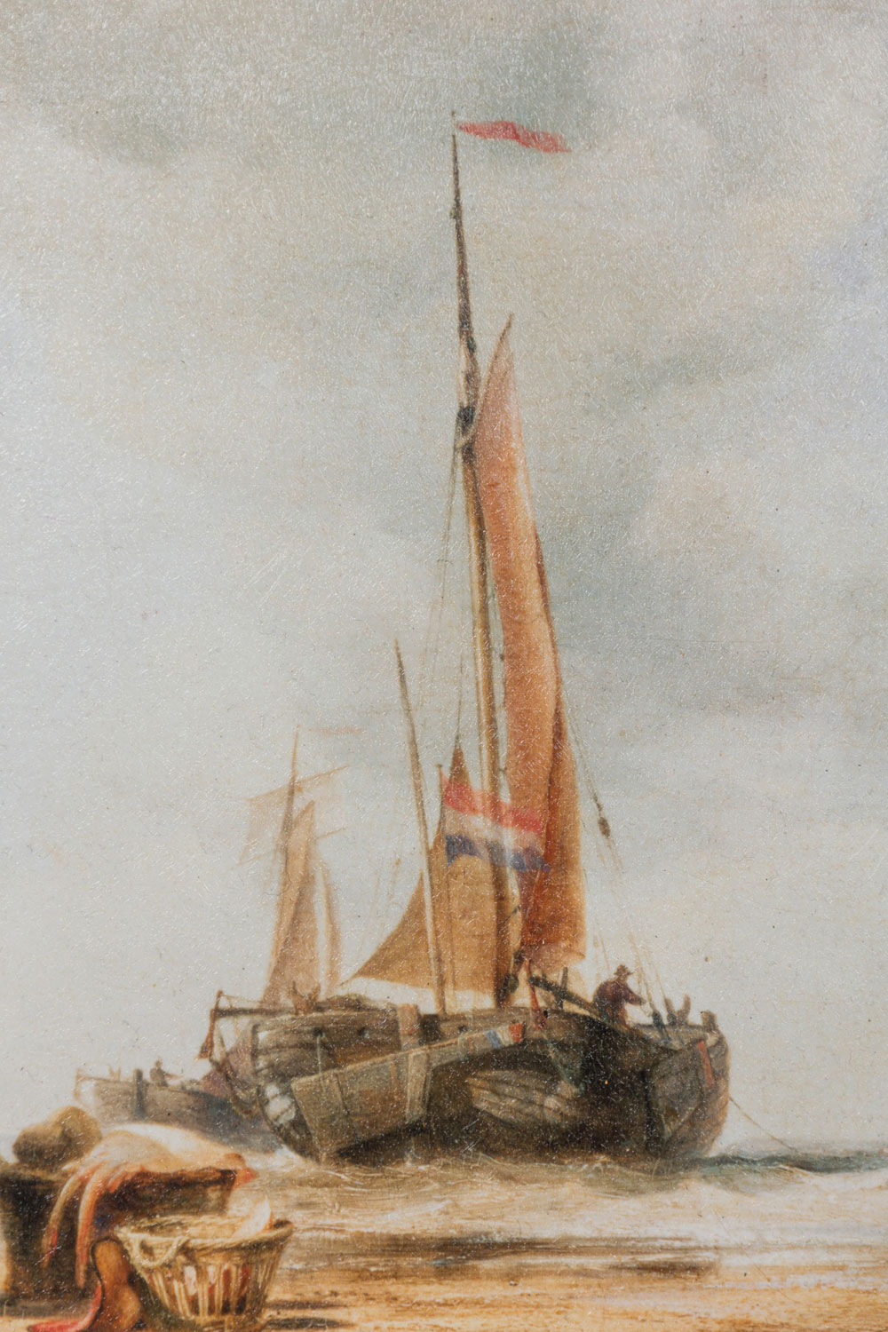 Copy of a landscape painting titled "Beach at Schevenigen" showing figures unloading boats