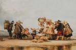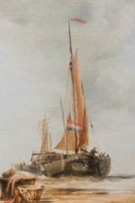 Copy of a landscape painting titled "Beach at Schevenigen" showing figures unloading boats.