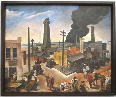 Copy of a painting by American Regionalist Thomas Hart Benton titled,"Boom Town" showing industry in motion in a rural town.