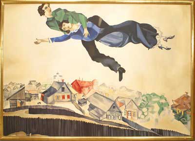 Copy of a painting by Marc Chagall titled "Over the Town" (c 1918) showing couple in air above their village.