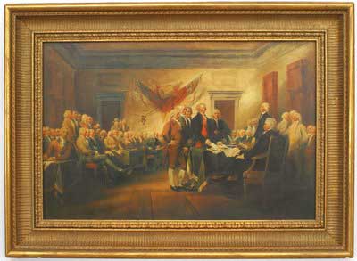 Copy of painting titled "Declaration of Independence" John Adams, Robert Sherman, Thomas Jefferson (presenting the document), and Benjamin Franklin--standing before John Hancock.