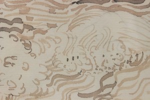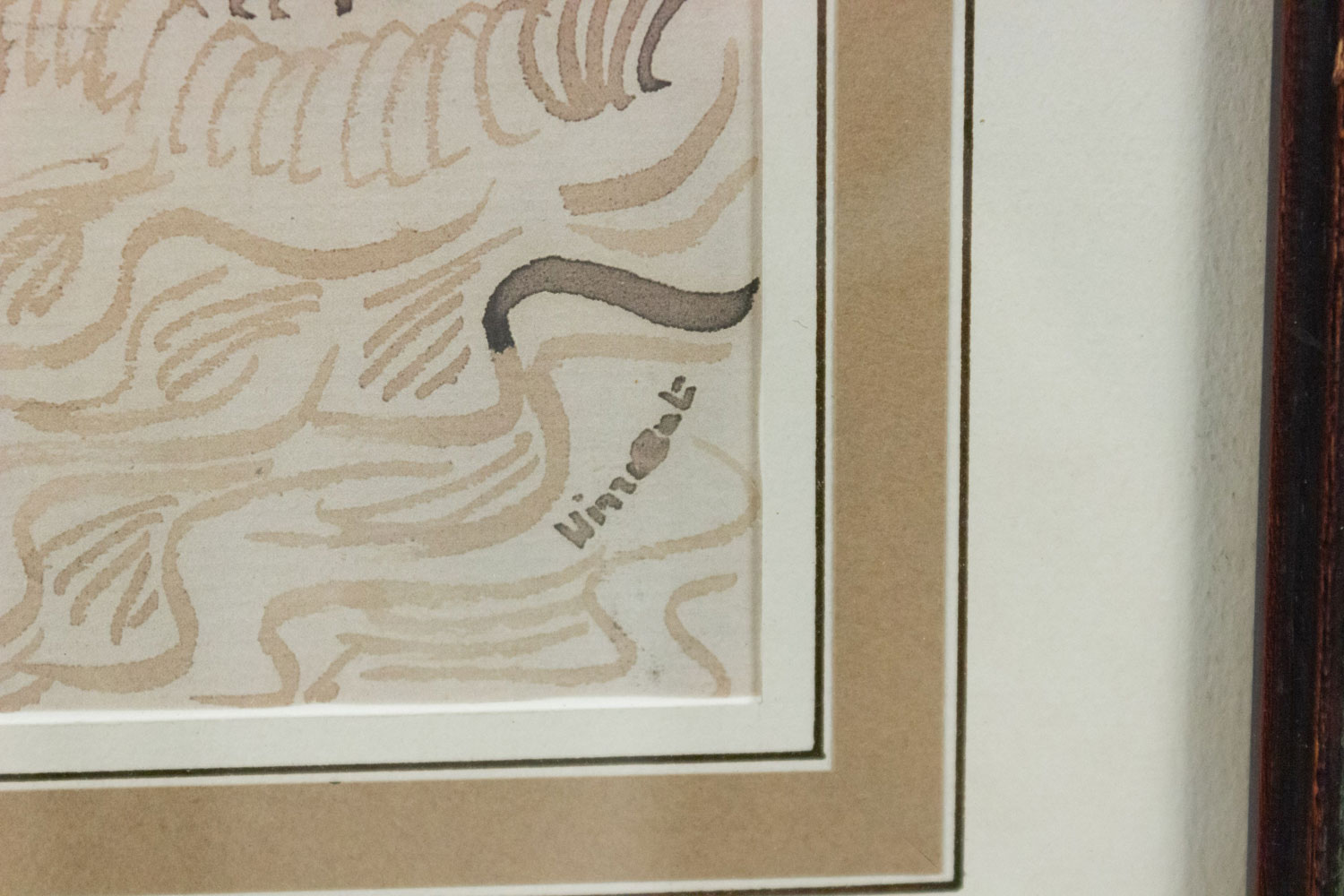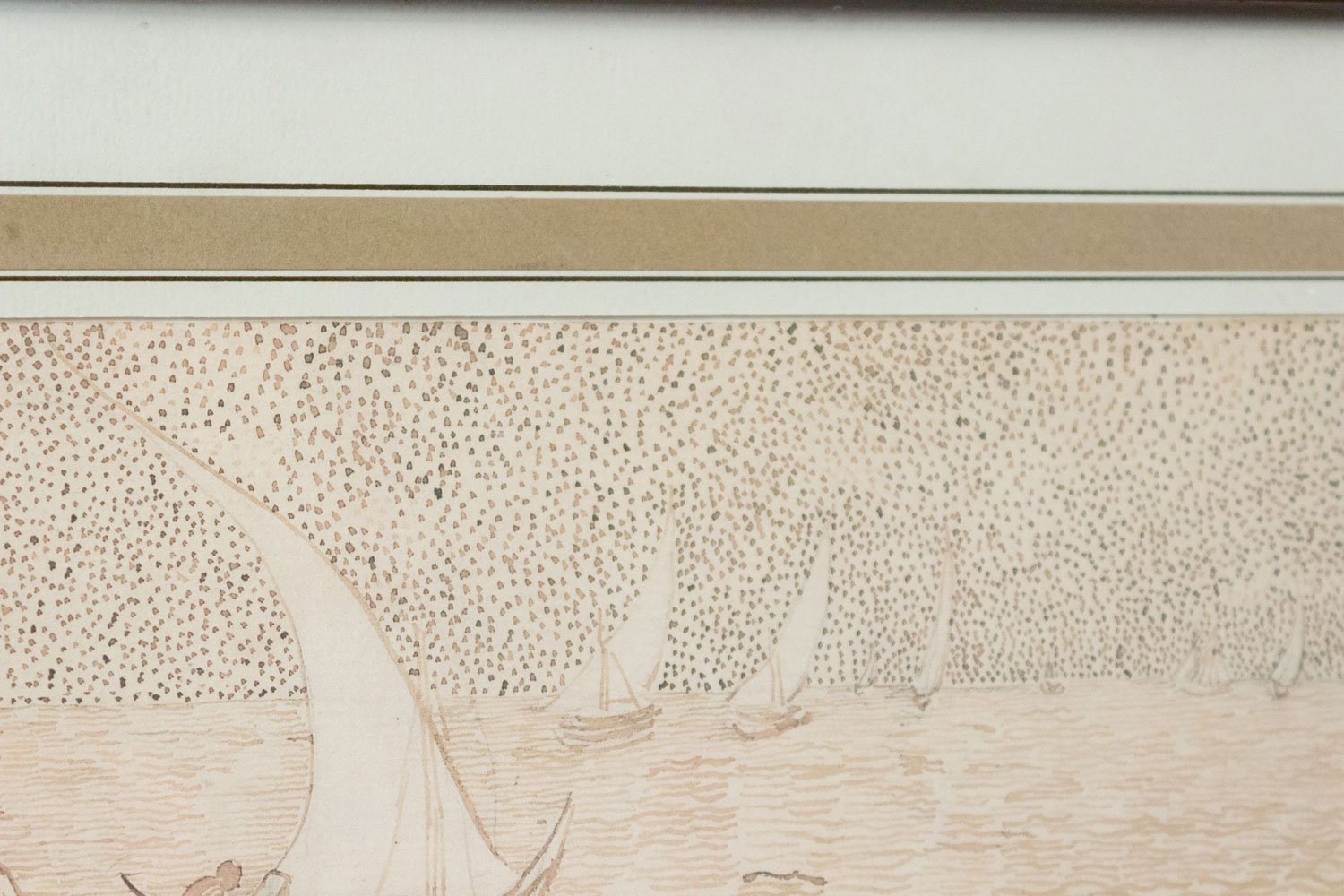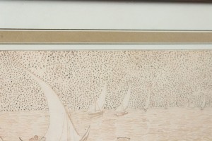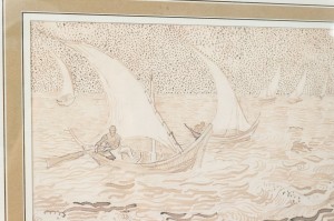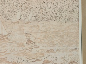 Copy of an impressionist seascape painting titled "Fishing Boats Near Saintes Maries" done in gold tone pen and ink.