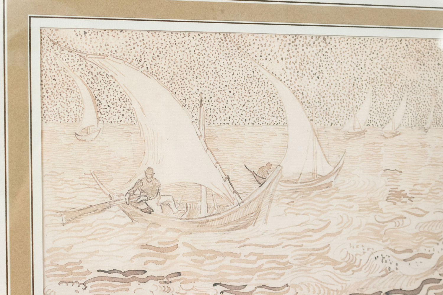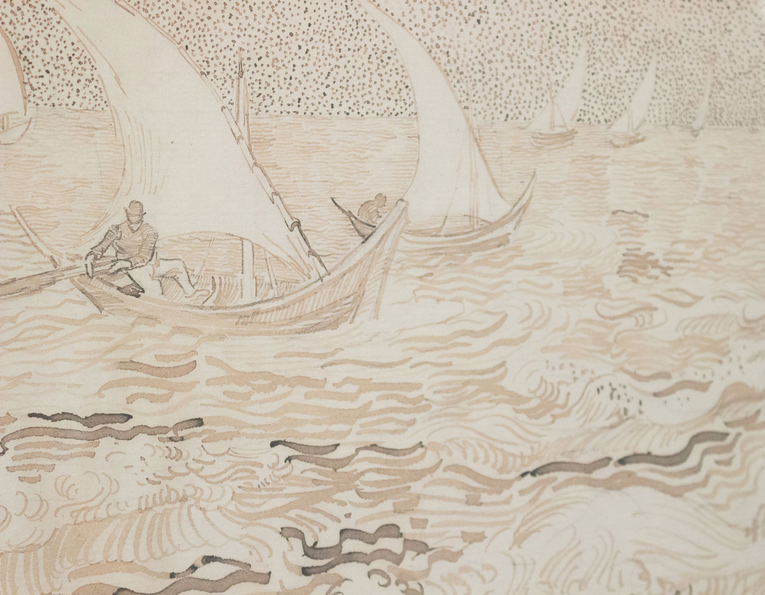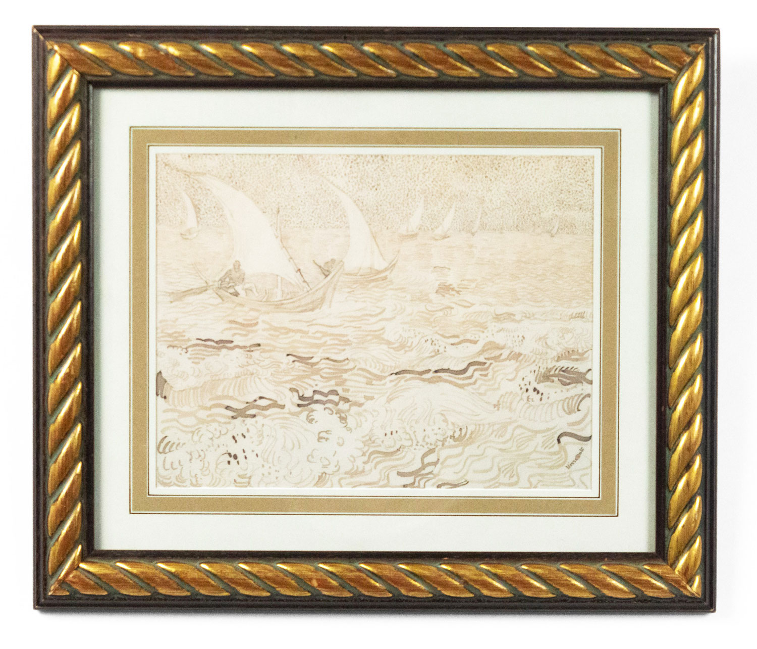 Copy of an impressionist seascape painting titled "Fishing Boats Near Saintes Maries" done in gold tone pen and ink