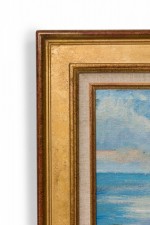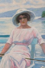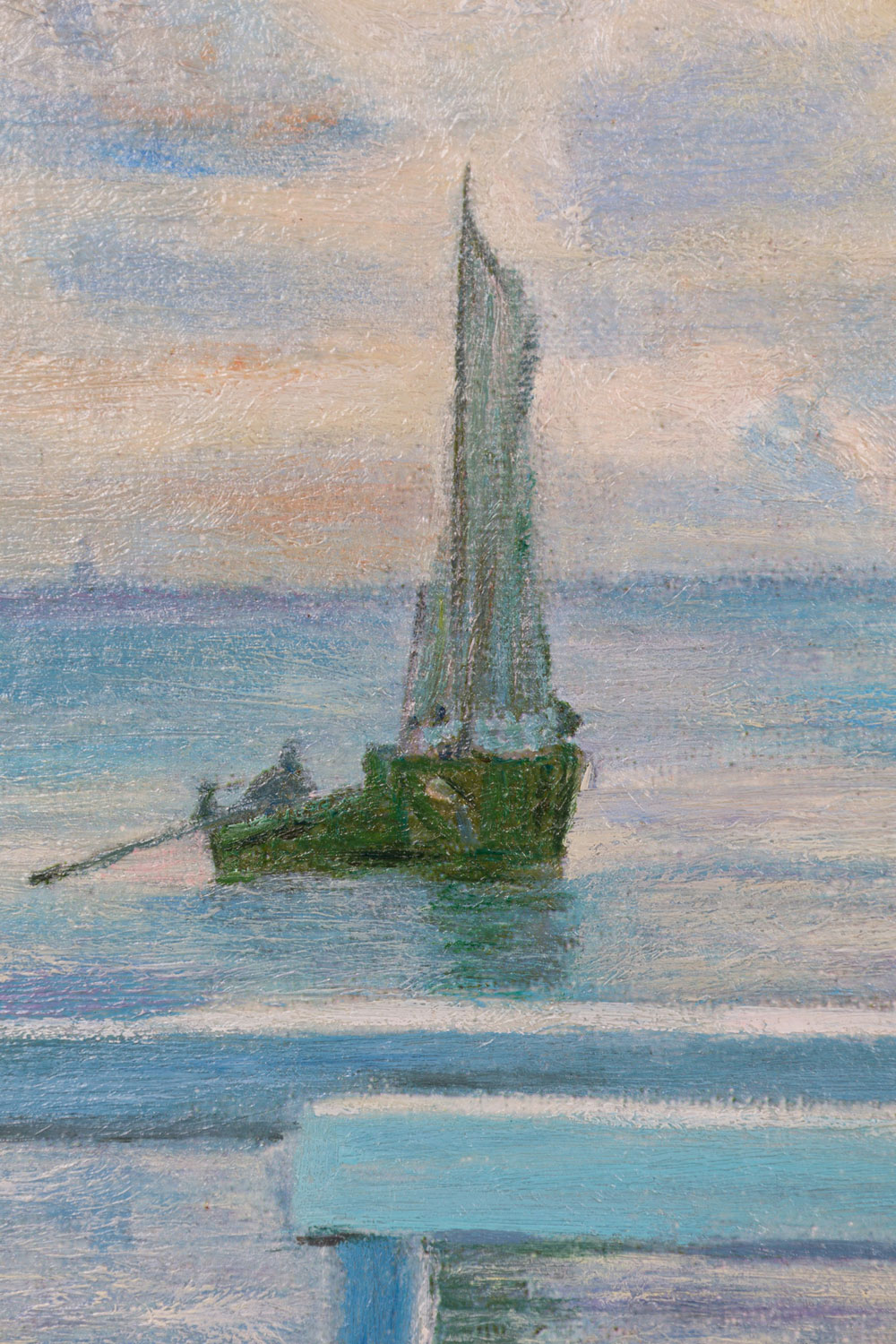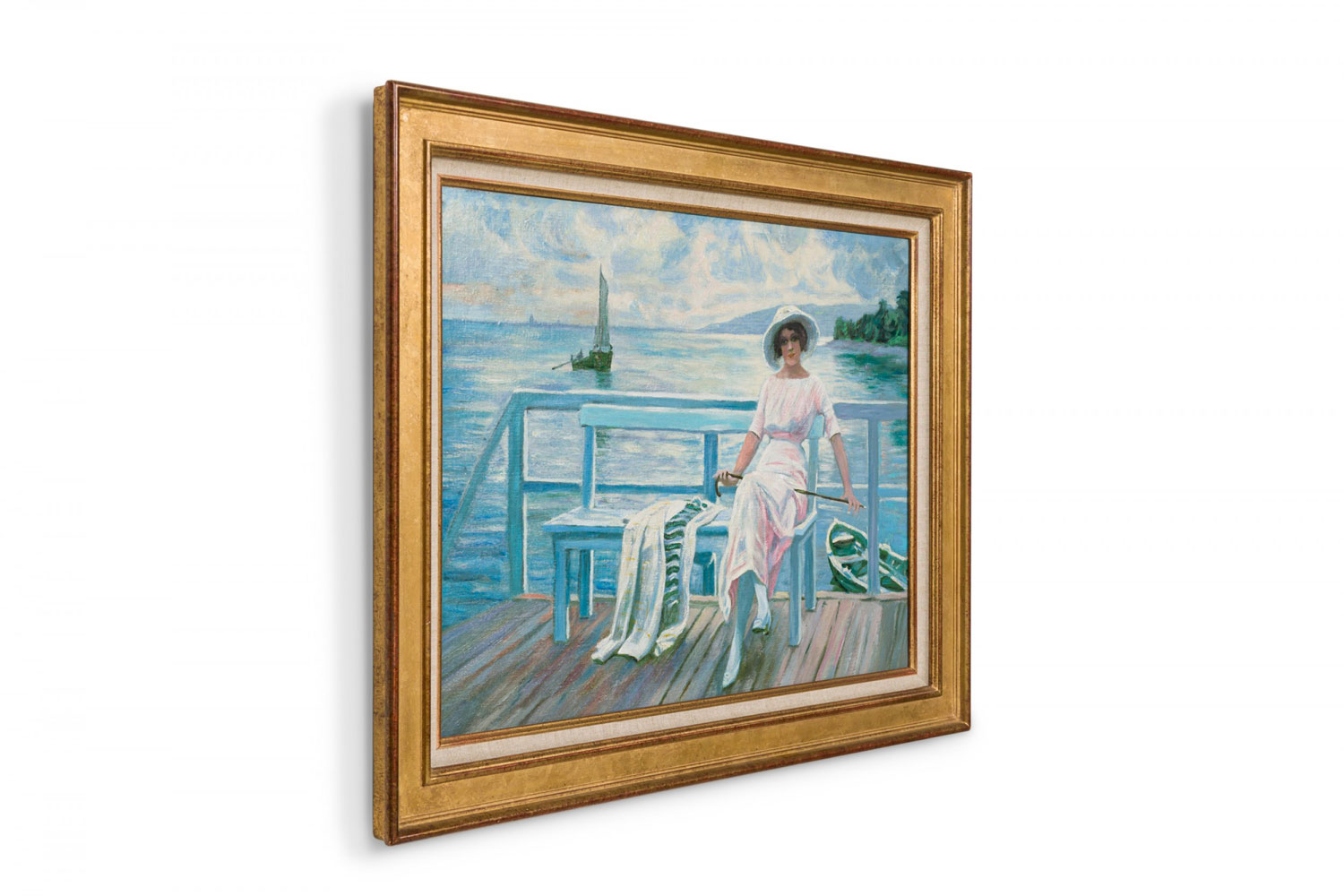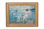 Copy of French Impressionist by Anonymous showing a woman on a dock with a sailboat in the distance.