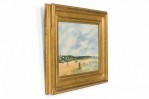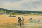 Copy of French Impressionist landscape painting "Beach at Deauville" showing people at the beach with a town in the distance.