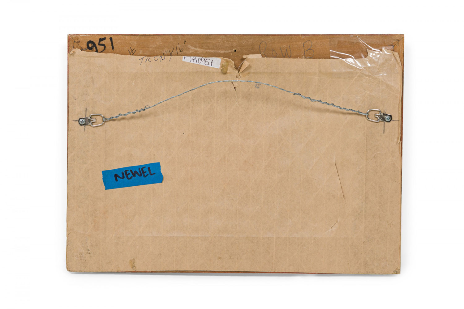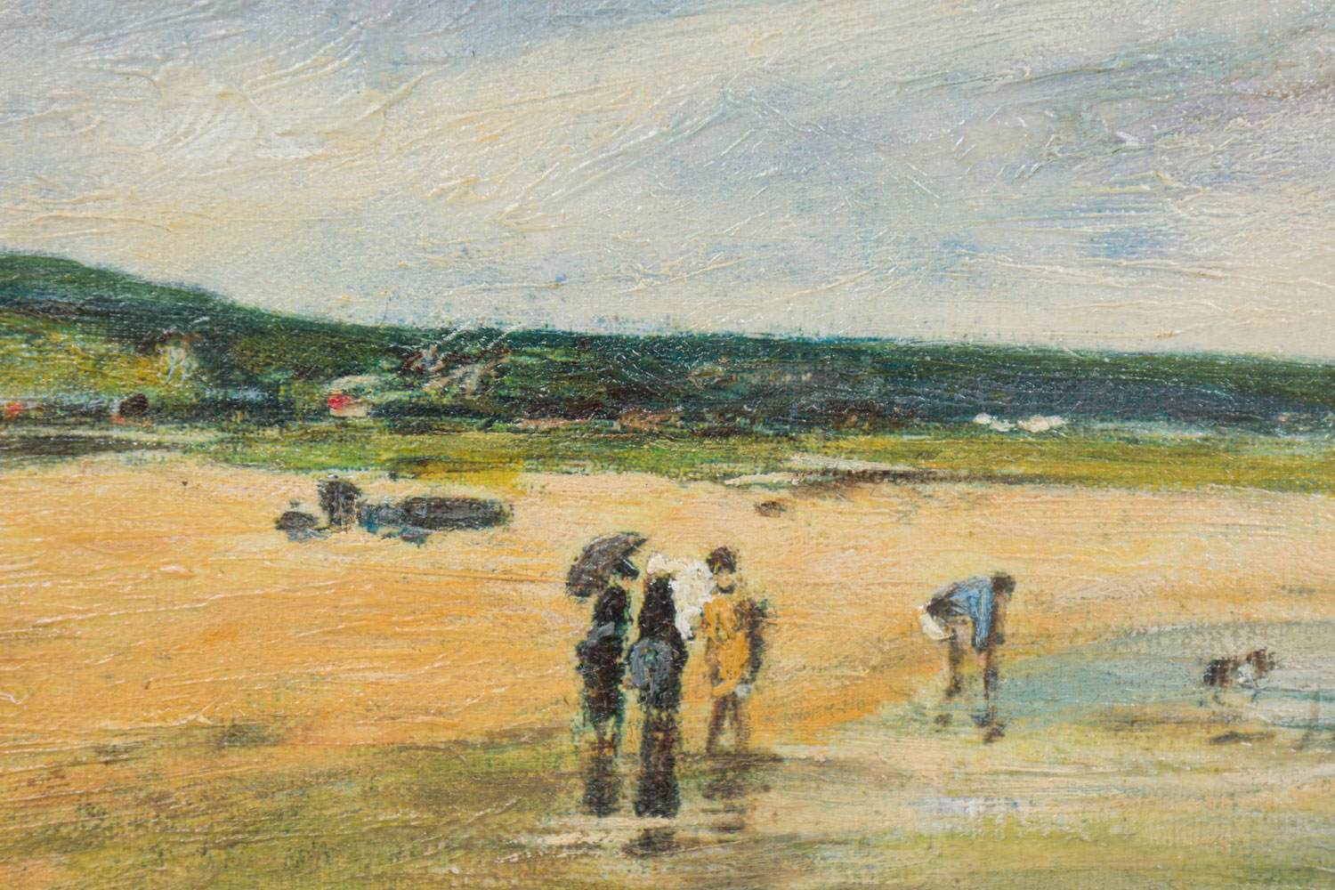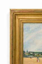 Copy of French Impressionist landscape painting "Beach at Deauville" showing people at the beach with a town in the distance