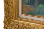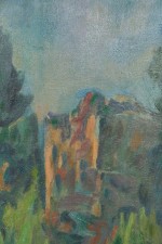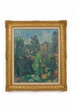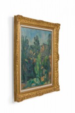 Copy of an impressionist vertical landscape titled "Bibemus Quarry" of forest with rock outcropping