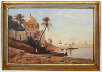 Copy of landscape titled "Edge of the Nile" showing group of men and camel by waters edge under palm tree, sailboat in background.