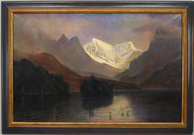 Copy of landscape painting titled "Mountain Scene" showing a snow capped mountain over a lake as the sun fades