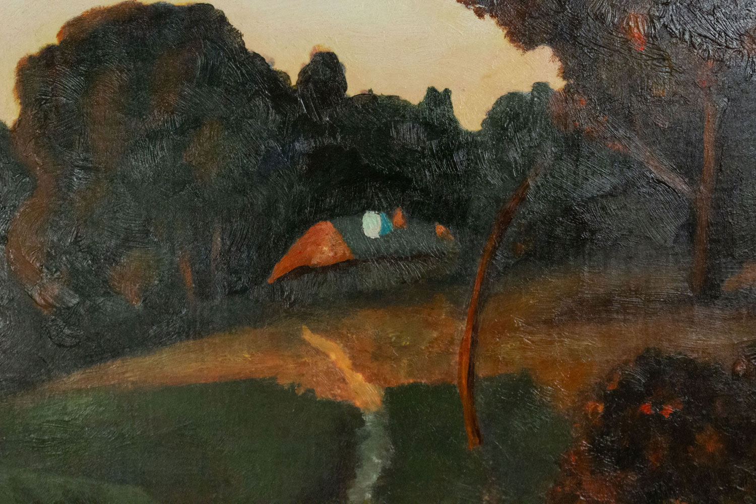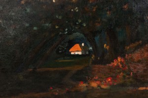 Copy of Impressionist landscape painting showing houses nestled in woods on a hillside.