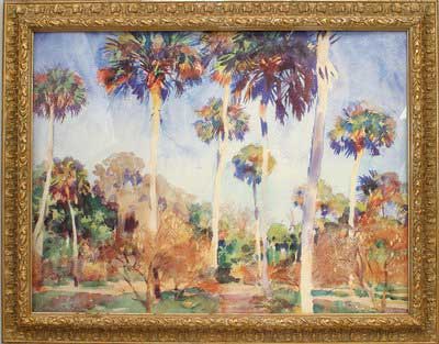 Copy of impressionist watercolor painting showing palm trees in a clearing under blue skies