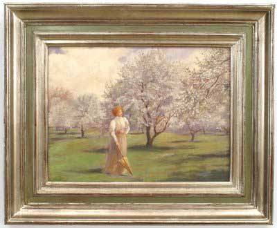 Copy of an impressionist landscape painting showing an Edwardian-era woman in an orchard of flowering trees