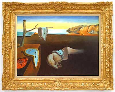 Copy of painting by Salvador Dali titled, "Persistence of Memory" Showing melting clocks in landscape.
