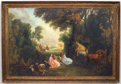 Copy of landscape painting titled "Return from the Hunter" Showing a lady being assisted off of her horse to join a party of dismounted riders relaxing in a classical setting.