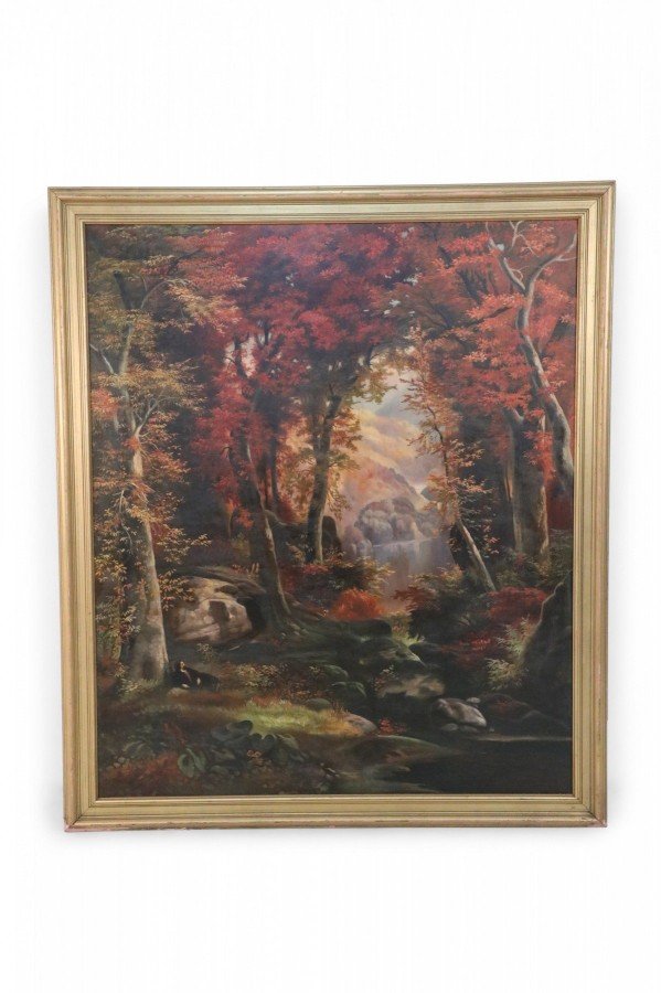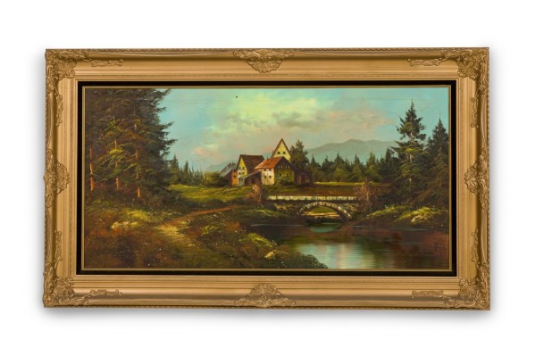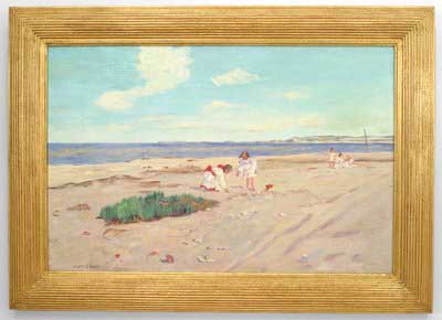 Gold framed copy of an impressionist landscape painting titled "Shell Beach" showing children collecting sea shells.