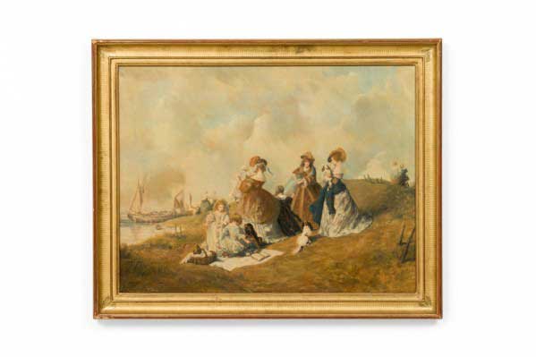 Copy of a vertical landscape painting showing a couple dancing al fresco