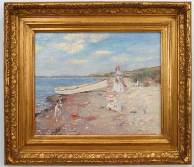 Copy of an Impressionist landscape painting titled "Sunny Day at Shinnecock Bay" showing figures and rowboat on a beach
