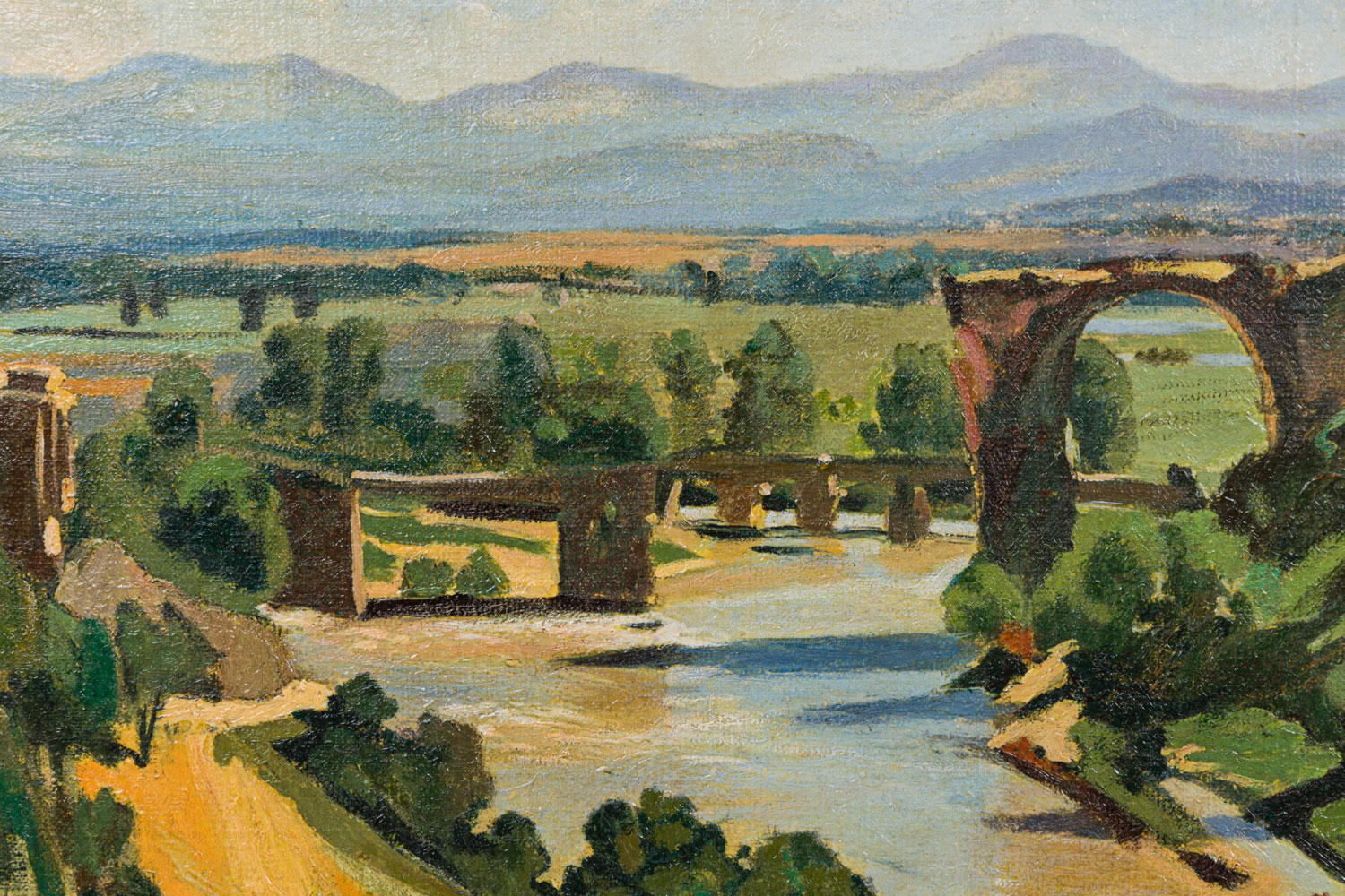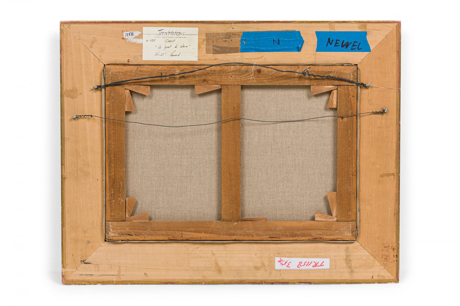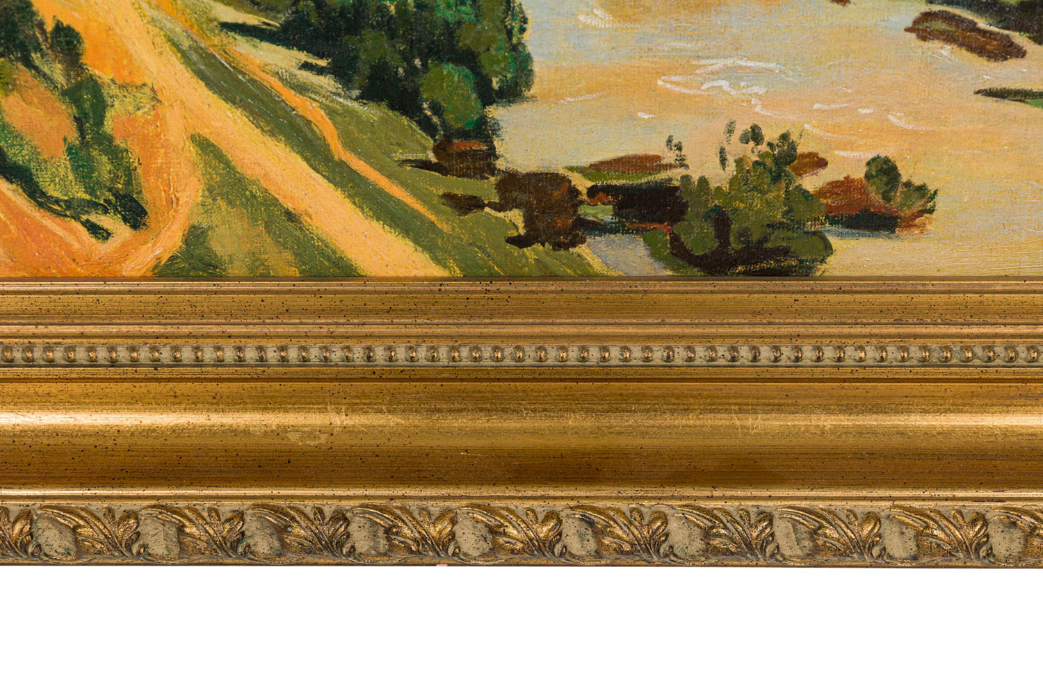 Copy of impressionist landscape painting titled "The Bridge at Narmi" showing landscape with river
