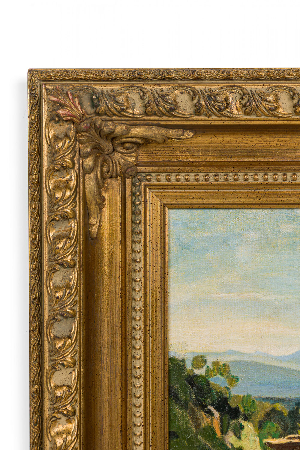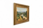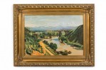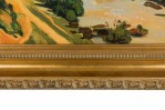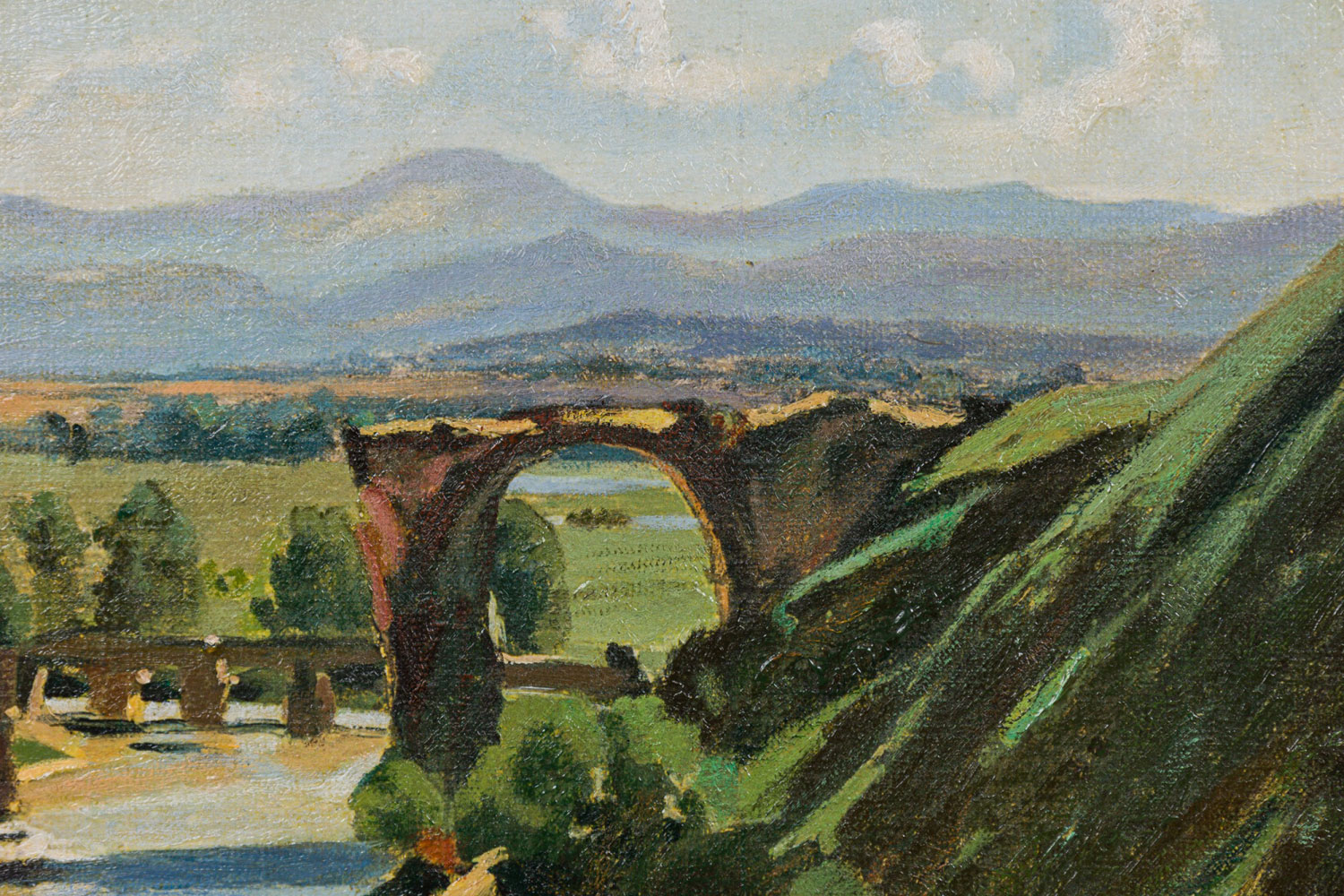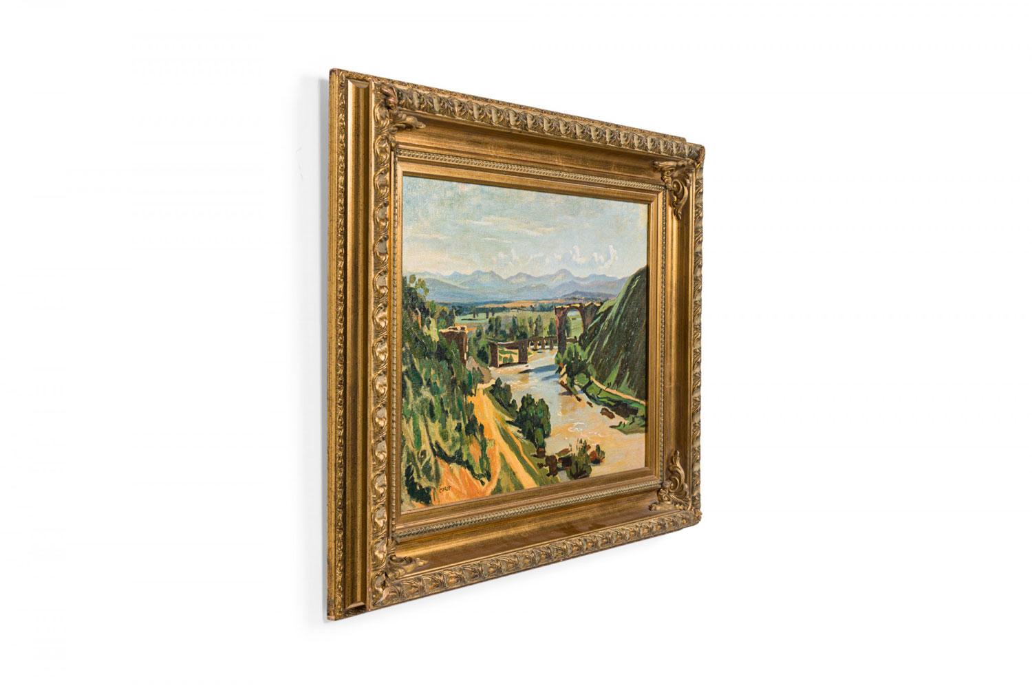 Copy of impressionist landscape painting titled "The Bridge at Narmi" showing landscape with river