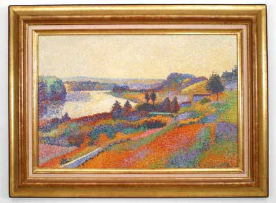 Copy of a painting titled "The Siene at Herblay" showing a post Impressionist Pointillist view of the landscape along the river.