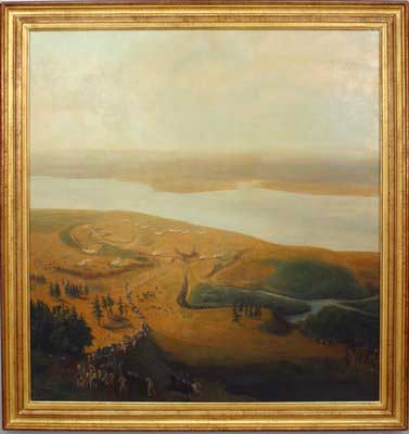 Copy of landscape painting titled "View of Yorktown" showing 1781 view of attack by Americans and French on the encampment in Virginia on a vertical landscape.