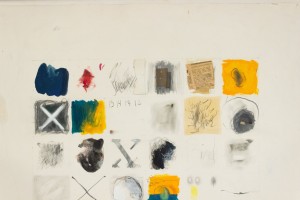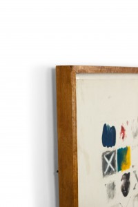 Copy of an unglazed mixed media abstract painting of stenciled letters in oil and collage on paper..
