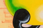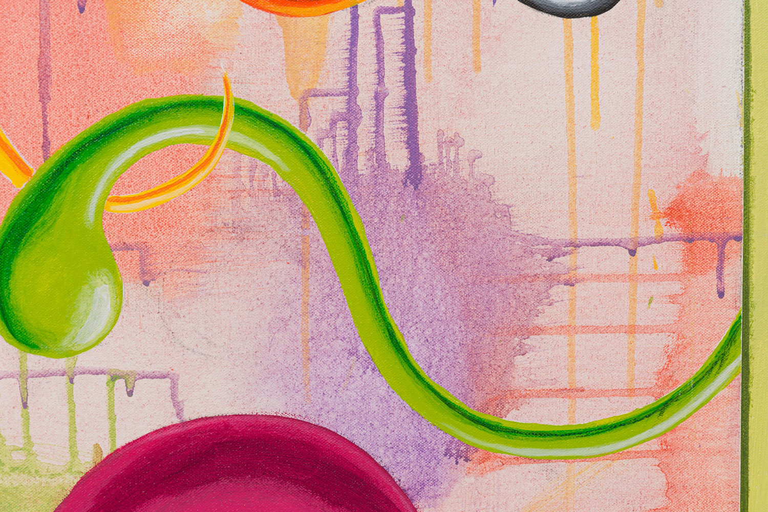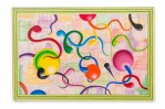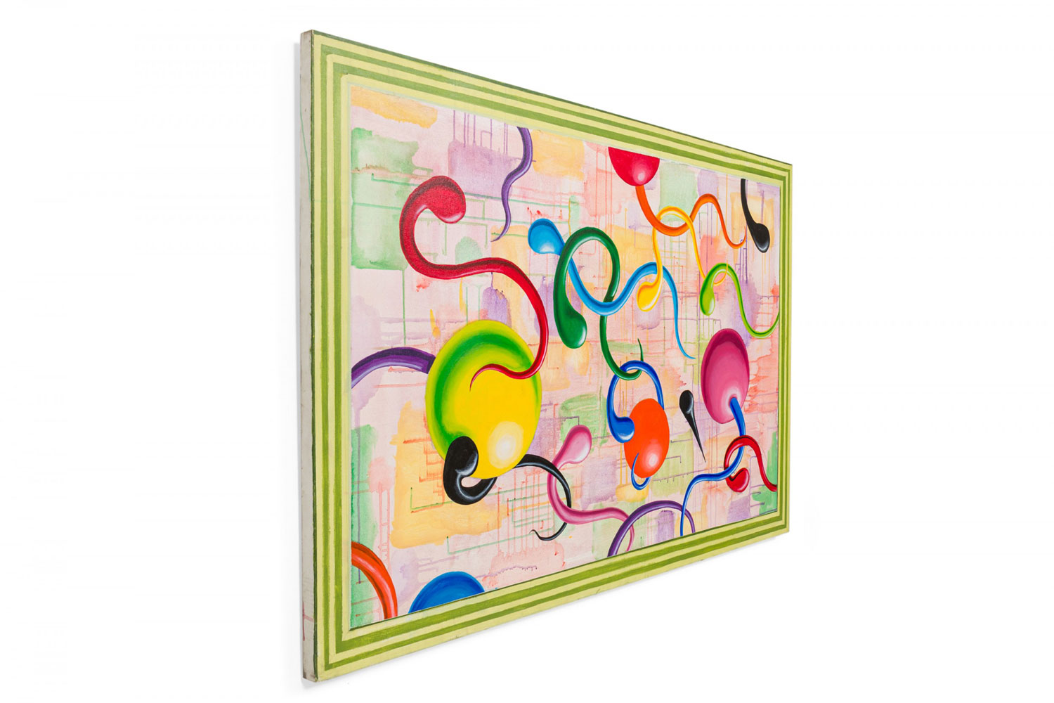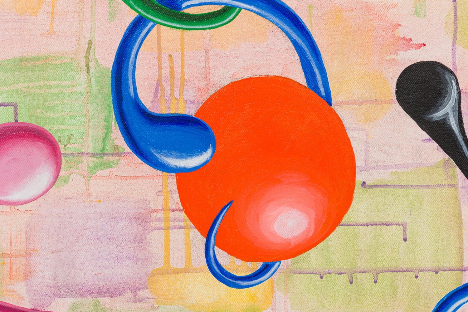 Copy of an abstract painting in a Modern Pop style in red, green, blue yellow and black against a plaid background.