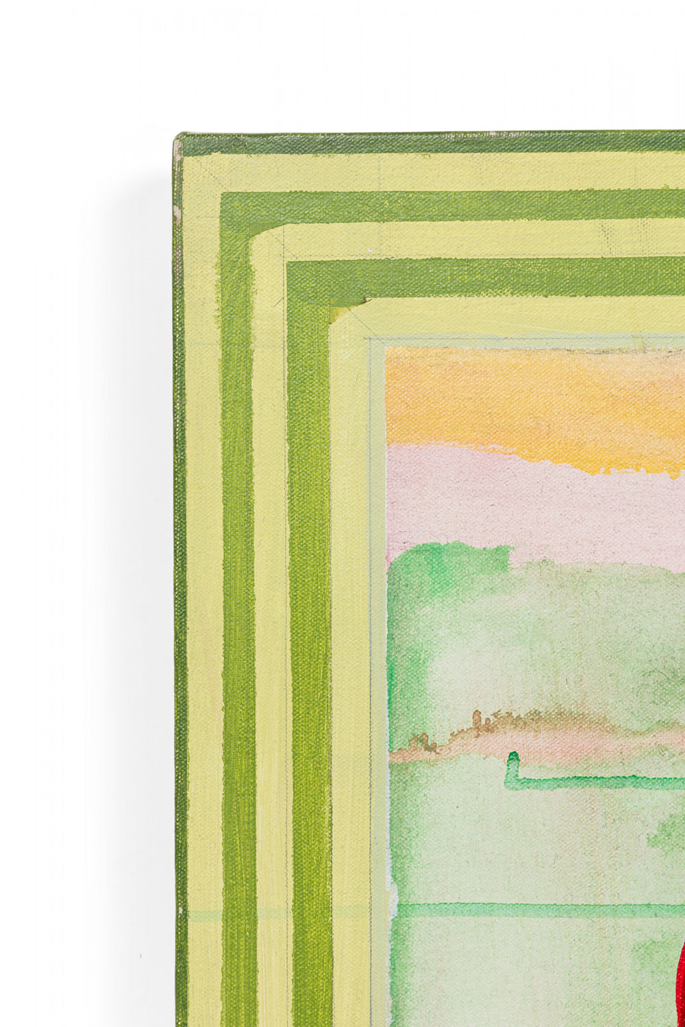Copy of an abstract painting in a Modern Pop style in red, green, blue yellow and black against a plaid background..