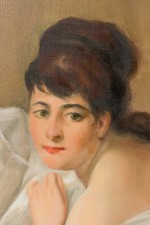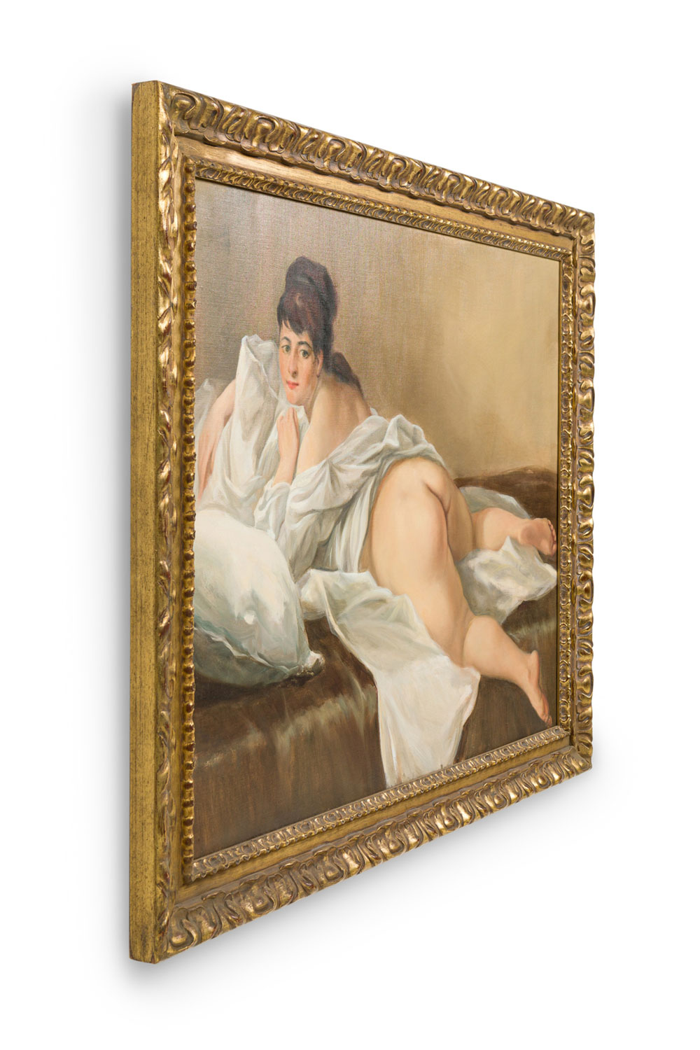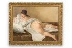 Copy of a painting titled "Nude" showing classical rendering of partially clothed nude on bed with pillows..