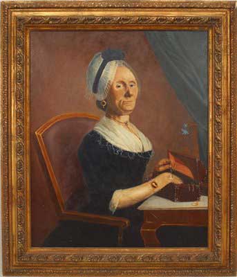Copy of a portrait painting titled "Portrait Puccini" showing woman in black dress with white lace rummaging through jewelry chest