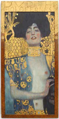 Copy of a Secessionist nude portrait painting titled "Judith I, 1901" showing woman in heavily patterned gold sheer kimono with gold background and sculpted frame