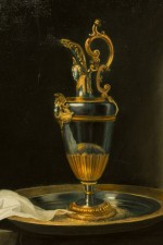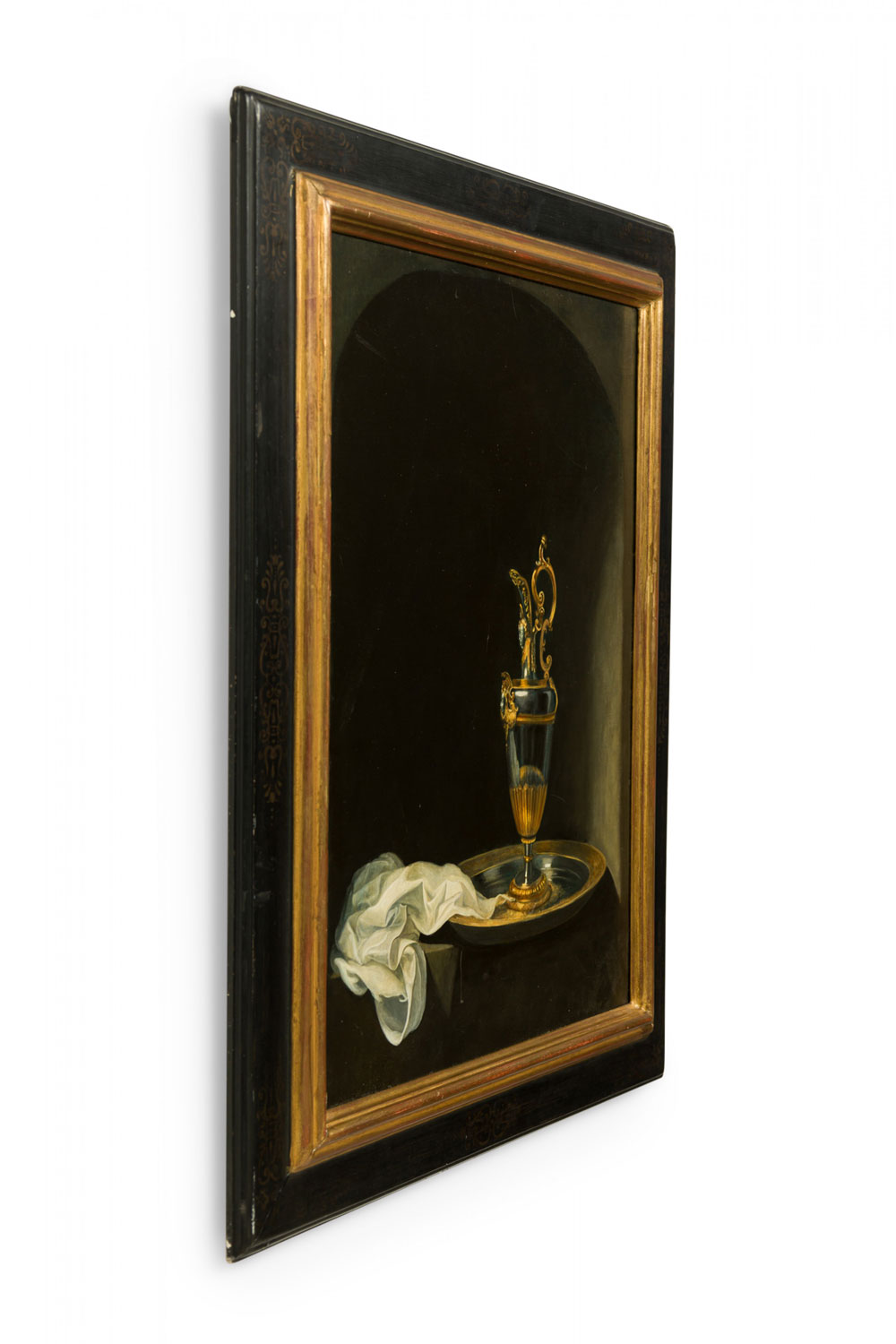 Copy of still life painting titled "Ewer" in a Dutch Flemish style showing a gold trimmed silver ewer on tray with cloth in alcove