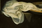 Copy of still life painting titled "Ewer" in a Dutch Flemish style showing a gold trimmed silver ewer on tray with cloth in alcove.