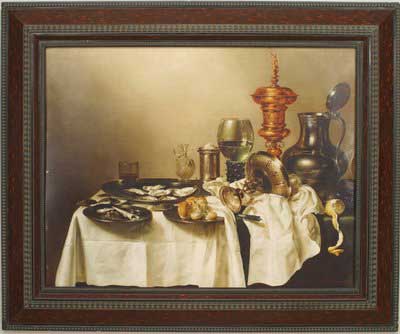 Copy of a Dutch Flemish painting titled "Still Life With Gilt Goblet" depicting food items on a serving table.
