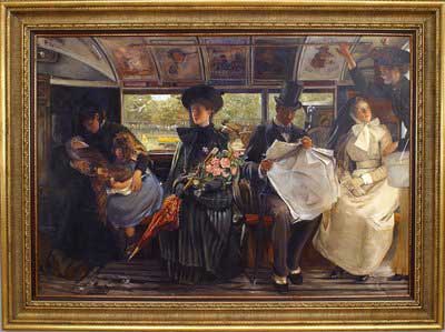 Copy of an interior genre scene titled "The Bayswatch Omnibus" showing figures in a bus