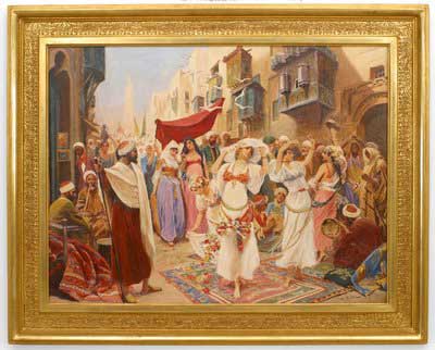 Copy of Middle Eastern streetscene painting "The Party" showing harem women dancing in crowded market square.