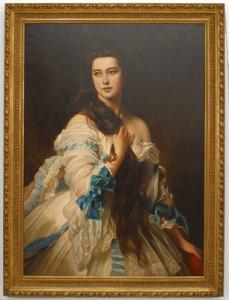Copy of a portrait painting titled "Two Girls at a Window" showing two women looking out of an open window