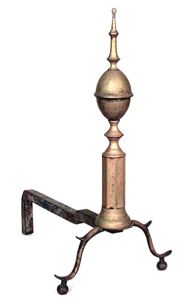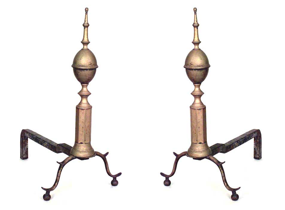 PAIR of American Country-style (19th Century) brass andirons with finial top and octagonal center section. (PRICED AS PAIR).