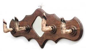 American Country Victorian horizontal oak wall hatrack with diamond shaped mirror and deer hoof hooks.