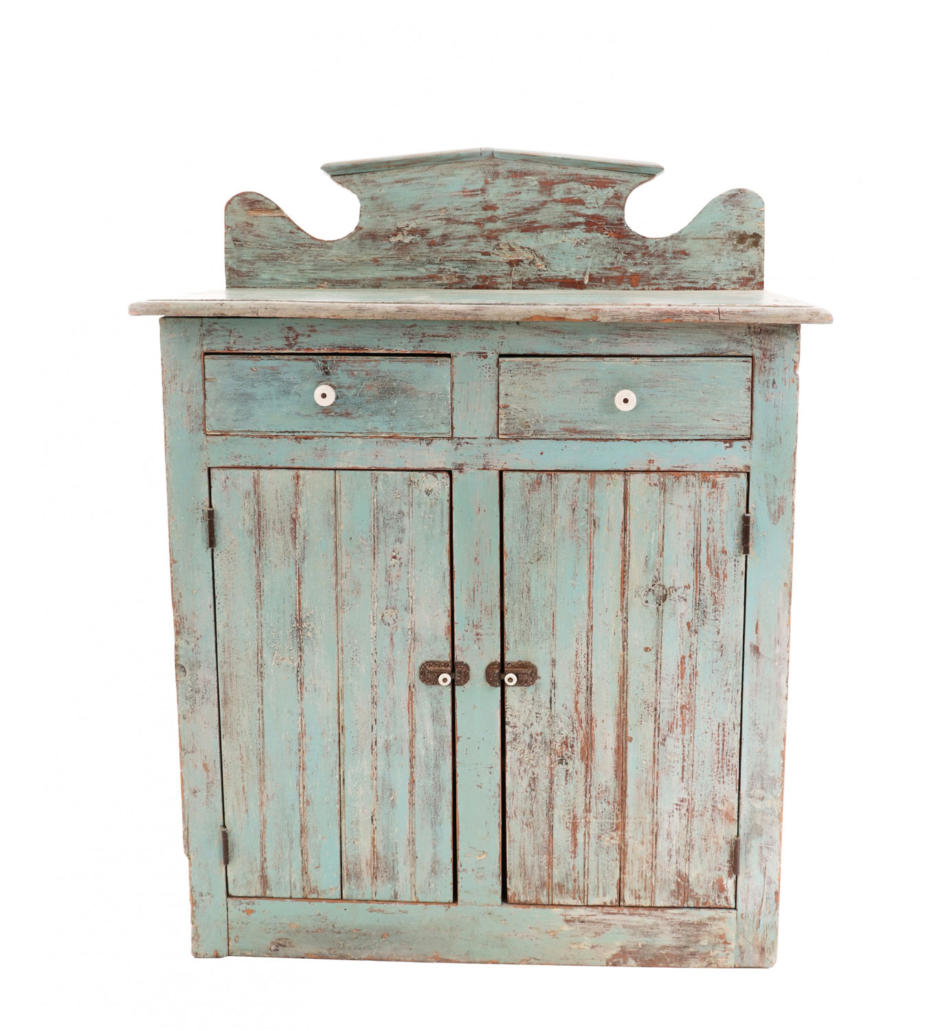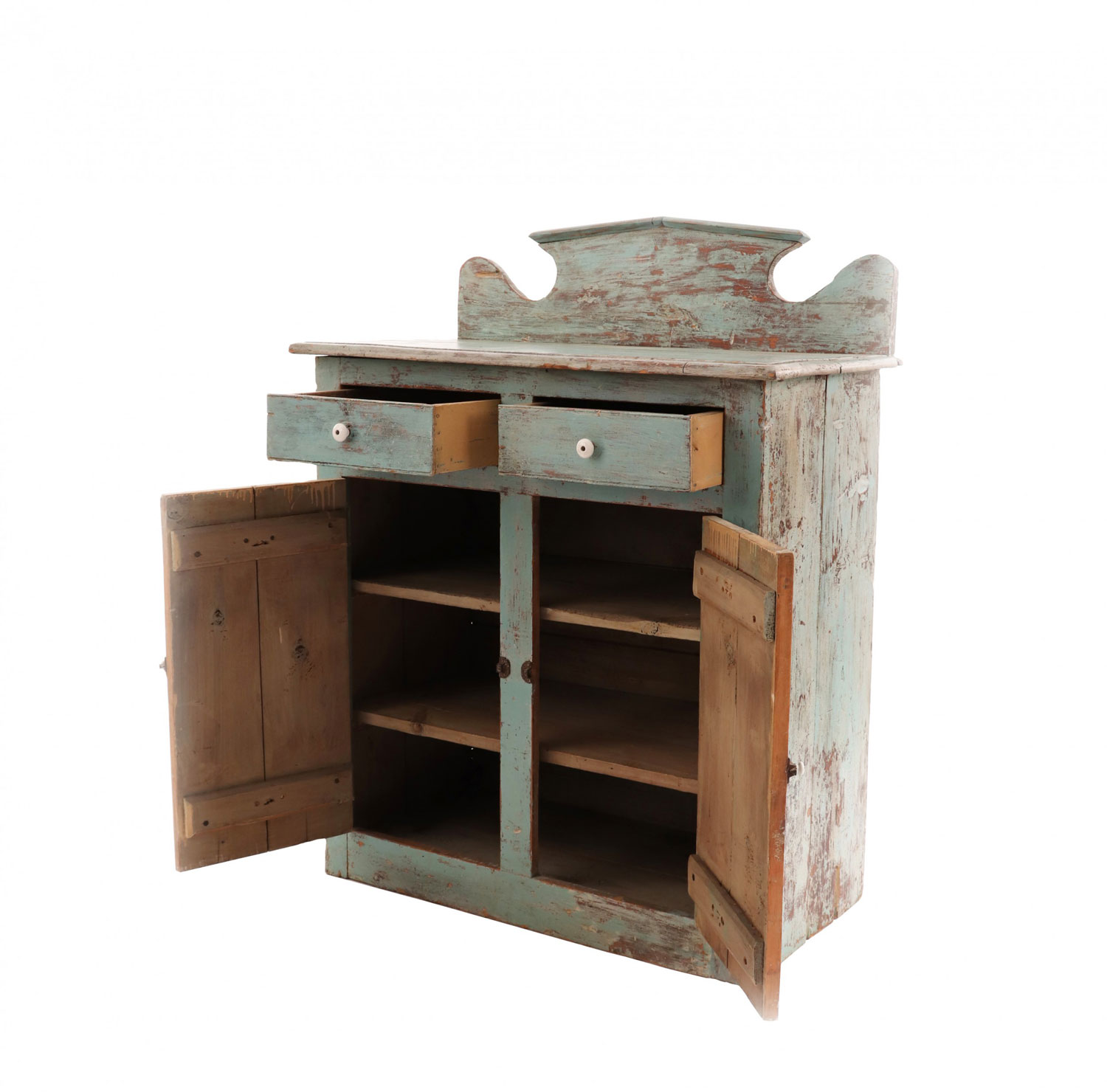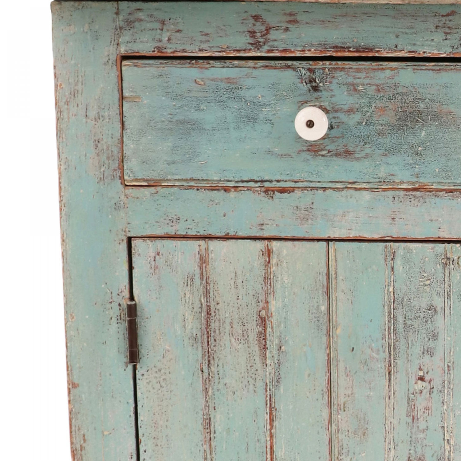 Country rustic Canadian (Ontario) blue painted wooden cabinet with a backrail, two drawers with white ceramic pulls, above two cabinet doors.